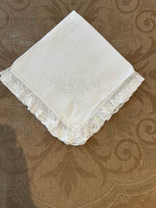 Estate/Vintage Ladies Handkerchief - Drawn Thread Flower on Linen With Lace Edge