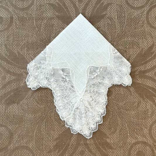 Estate/Vintage Ladies Handkerchief - Cream Cotton With Ornate Lace Edge