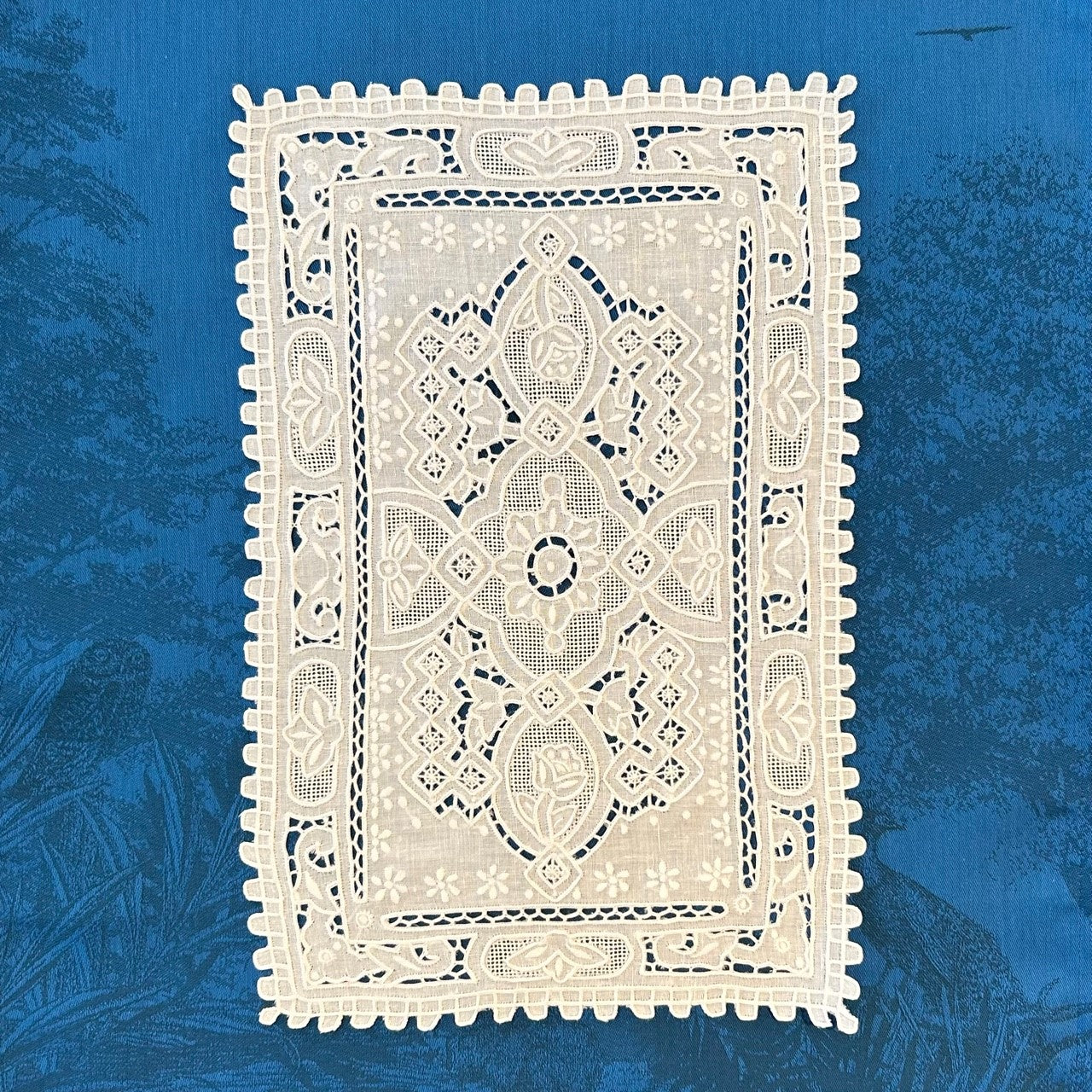 Hand embroidered 100% linen placemats in an elegant flywheel motif.