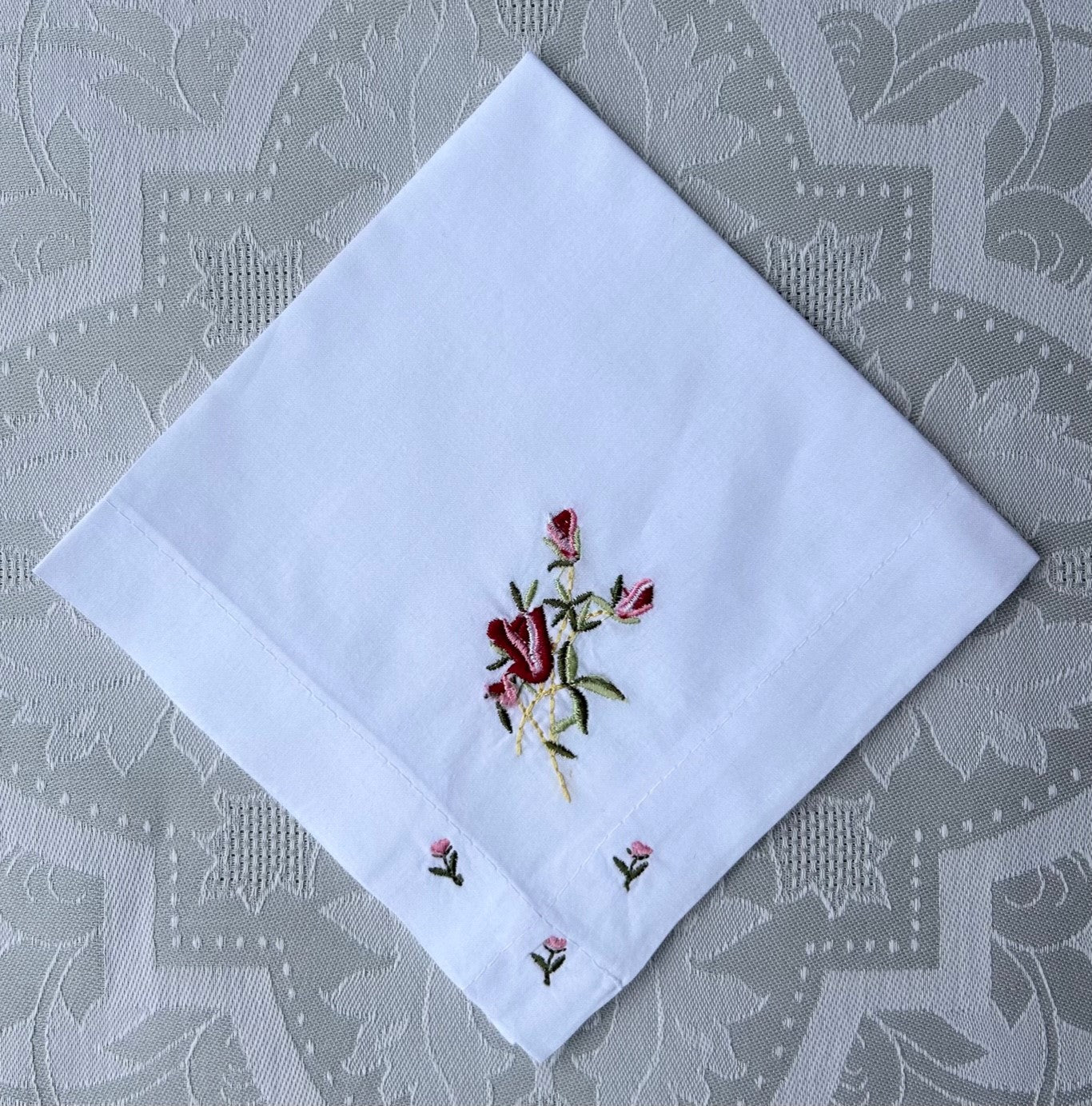 Handkerchief - Ladies 100% Cotton with Embroidered Rosebud