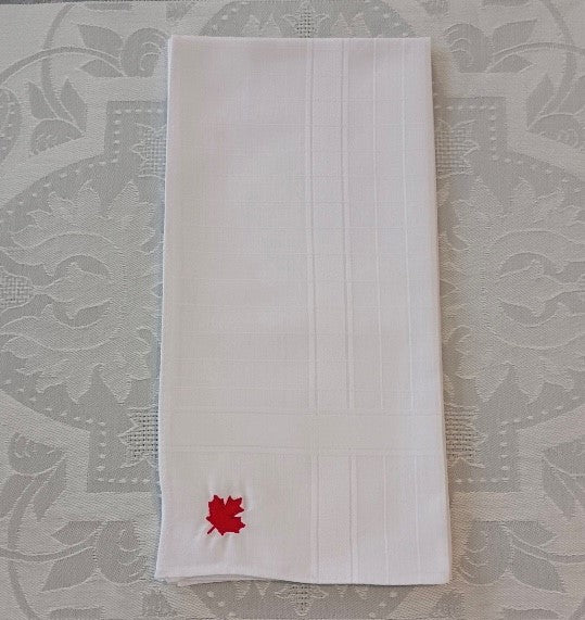 Handkerchief - Men's White 100% Cotton, Satin Borders, with embroidered Canadian Maple Leaf